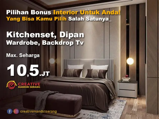 Pilihan Bonus diakhir, Mulai dari Free Kitchen Hpl, Dipan, dan interior lainnya.